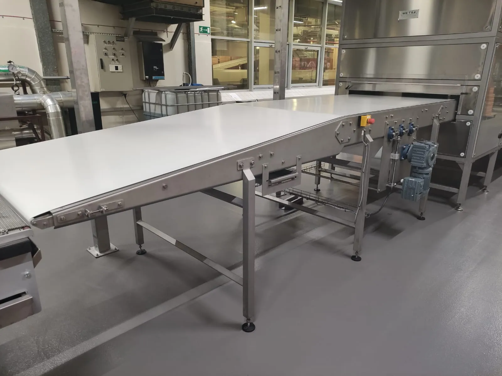 Projekt obejmował zaprojektowanie i wykonanie linii transportowej dla delikatnych wyrobów cukierniczych – herbatników. Kluczowym wyzwaniem była szerokość strugi produktu (taśmy o szerokości 1200 mm) oraz konieczność zachowania najwyższych standardów higienicznych przy dużej wydajności.